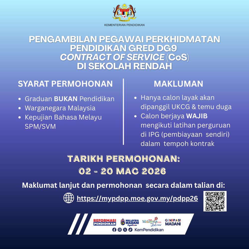 Kementerian Pendidikan Malaysia (KPM) secara rasmi membuka peluang keemasan kepada graduan Bukan Pendidikan untuk menyertai perkhidmatan awam sebagai Pegawai Perkhidmatan Pendidikan Gred DG9 secara Contract of Service (CoS) di sekolah rendah.