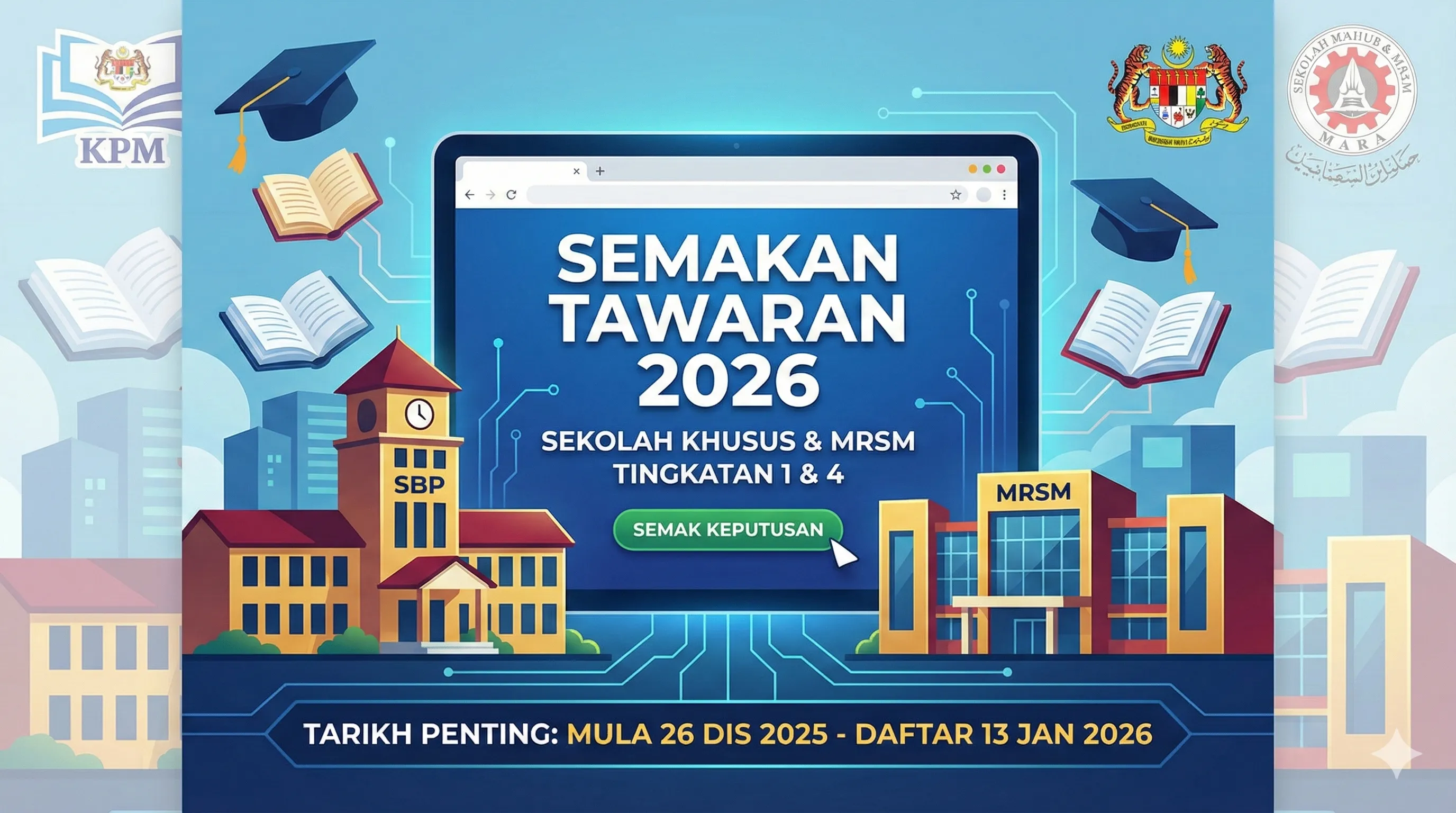 Kementerian Pendidikan Malaysia (KPM) dan Majlis Amanah Rakyat (MARA) telah mengumumkan tarikh rasmi bagi semakan tawaran kemasukan ke Sekolah Khusus (seperti SBP, SMKA, SM Teknik, KV) dan MRSM bagi sesi persekolahan tahun 2026.