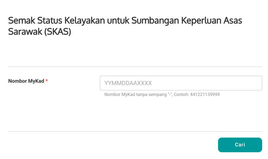 Langkah 2: Cari Pautan Semakan SKAS Di halaman utama portal, cari pautan atau butang yang tertera "Sumbangan Keperluan Asas Sarawak (SKAS)" atau "Check Eligibility" (Semak Kelayakan).