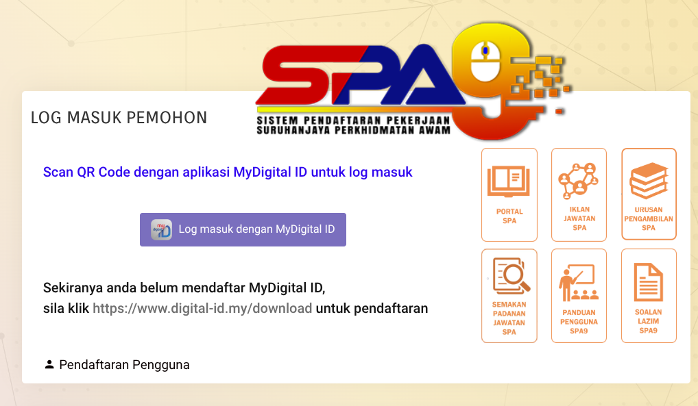 Bermula sekarang, semua urusan log masuk ke Sistem Pendaftaran Pekerjaan Suruhanjaya Perkhidmatan Awam (SPA9) adalah wajib menggunakan MyDigital ID.